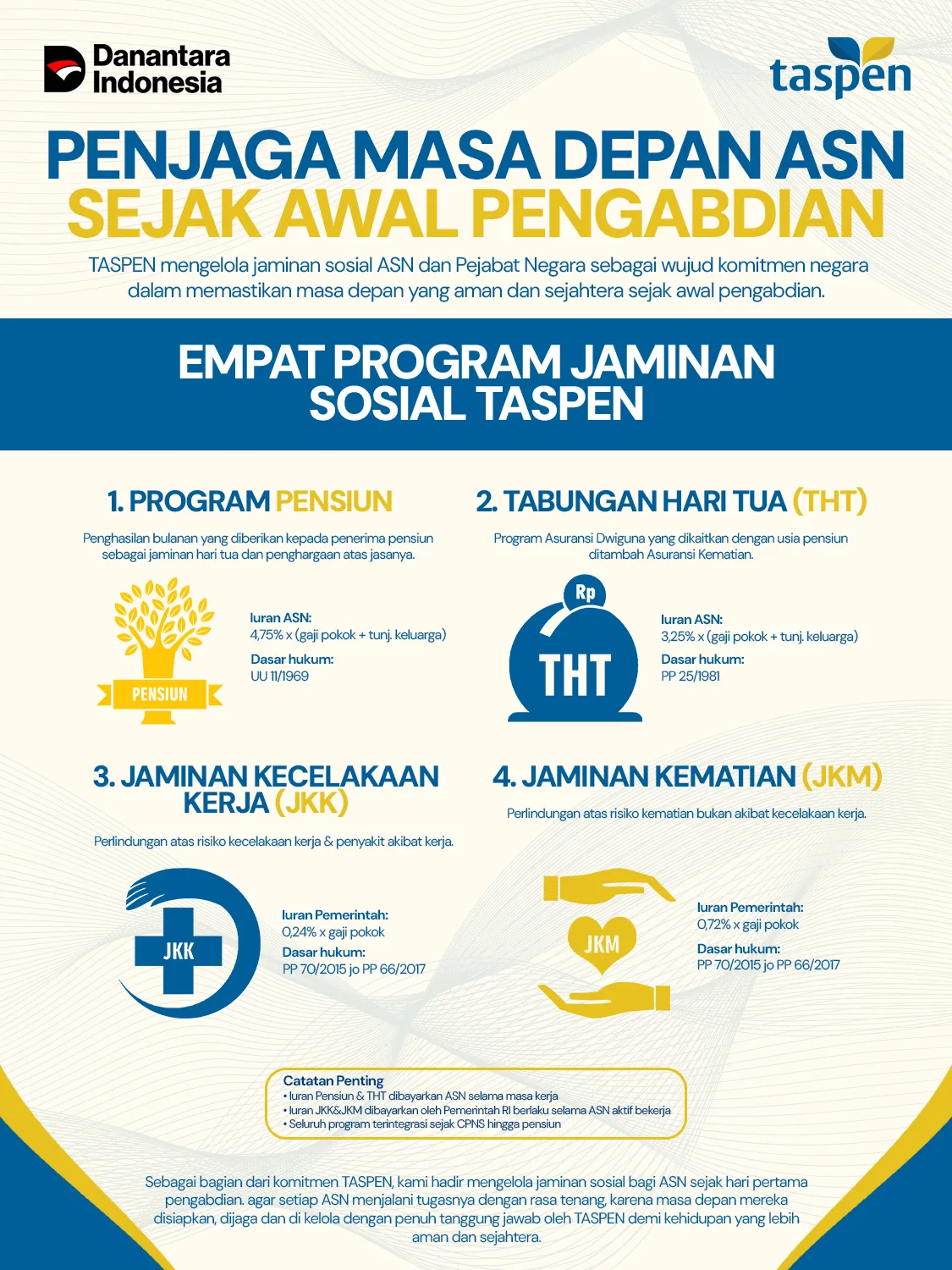 TASPEN berkomitmen mendampingi ASN sejak CPNS hingga setelah purna tugas. Bersama TASPEN, masa depan ASN lebih aman, terlindungi, dan sejahtera.